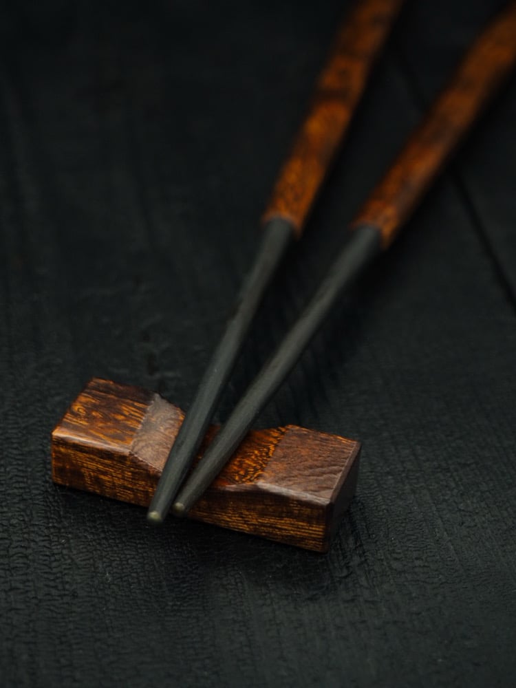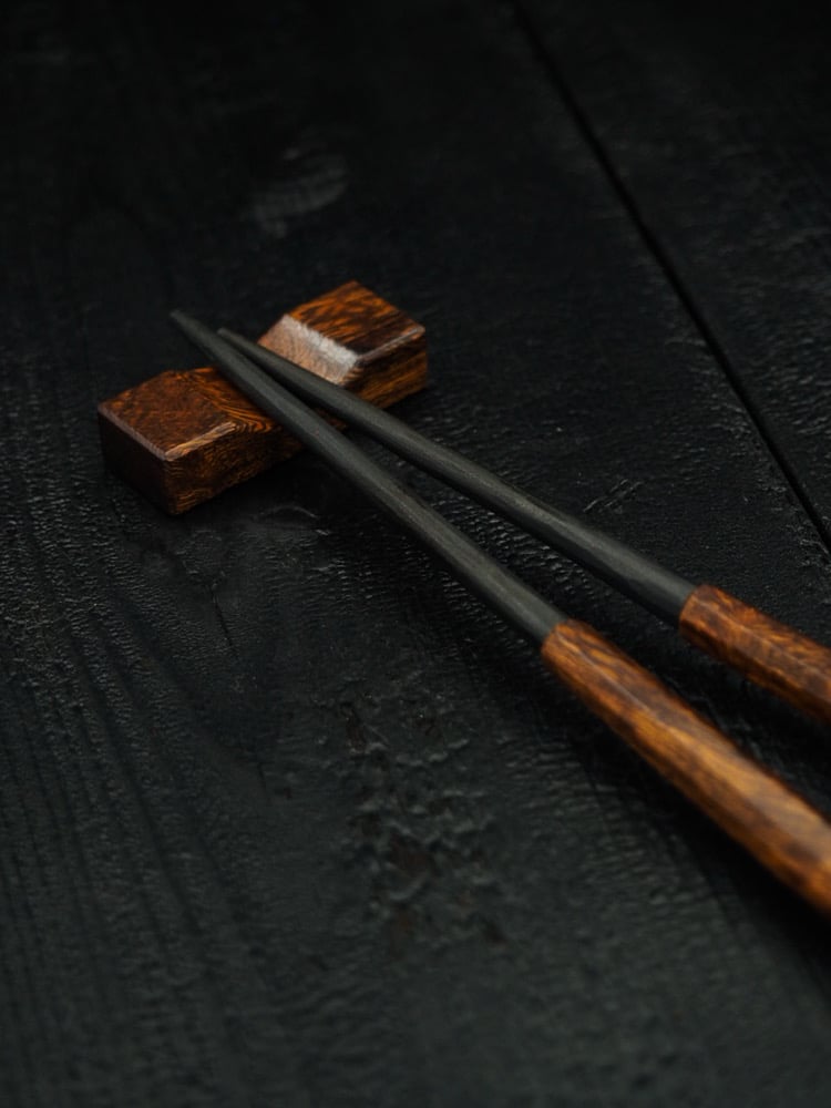 Set of deeply polished desert ironwood chopsticks with hand forged stainless steel tips in a rustic blackened (kurouchi) finish. The top of the chopsticks tapers from a top rectangular octogonal shape down to a square octogone and then to the hand shaped round steel tips. This set comes with an elegant polished desert ironwood chopstick rest, carved from the same piece of material as the chopsticks.