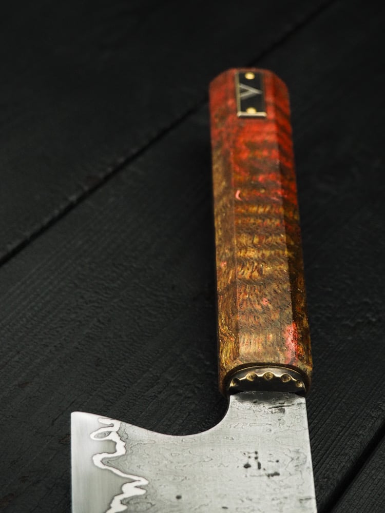 Dressed in stabilized red and natural curly mango with aged brass hardware, this compact Gyutō will cut through food like a laser. Being only 2 mm thick at the neck, and tapering down to a thin and precise tip, this knife is nimble, precise and easy on the wrists. It was built with noble materials that will last a lifetime and more. It’s also a serious food prep competitor thanks to its very thin full convex geometry.