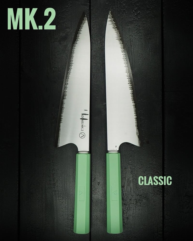 Handle material: Vacuum cast PU resin handles with molded Adonis logo on each side. SikaBiresin PX331 in "machine green" color, as a tribute to those iron machines that are a blacksmith’s cherished partners in crime. Bead blasted stainless steel ferrule