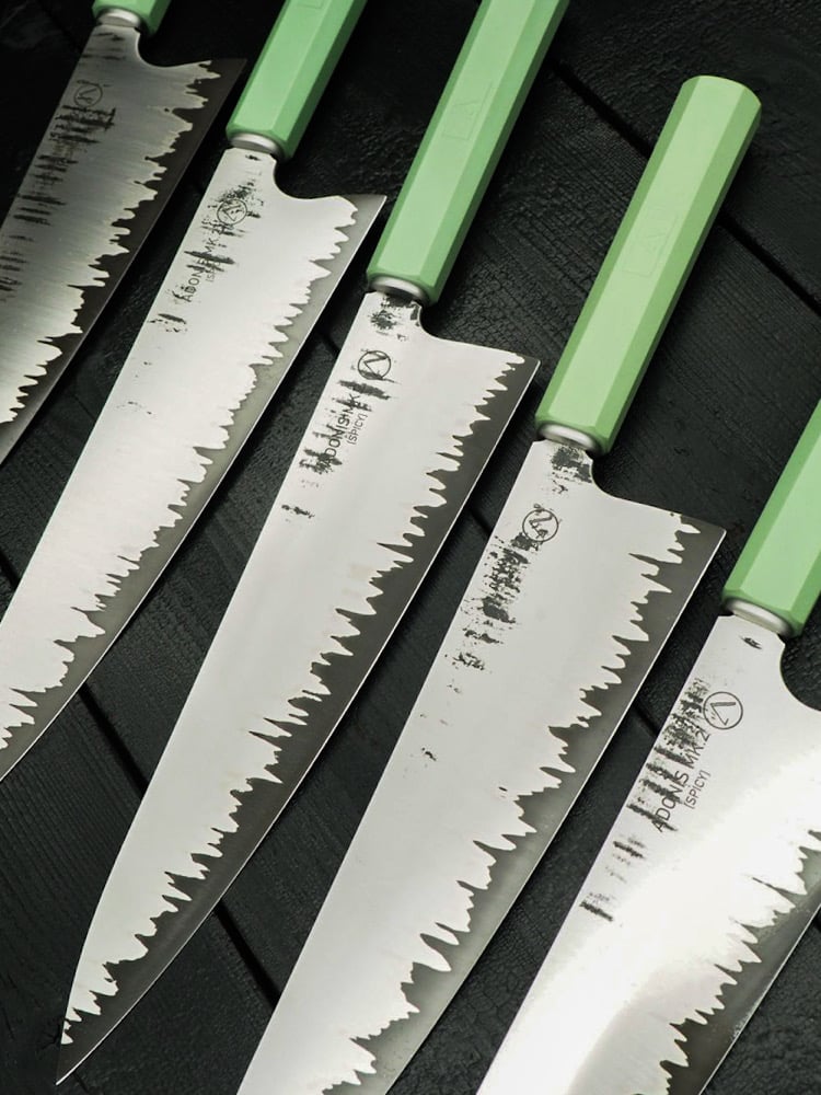Handle material: Vacuum cast PU resin handles with molded Adonis logo on each side. SikaBiresin PX331 in "machine green" color, as a tribute to those iron machines that are a blacksmith’s cherished partners in crime. Bead blasted stainless steel ferrule